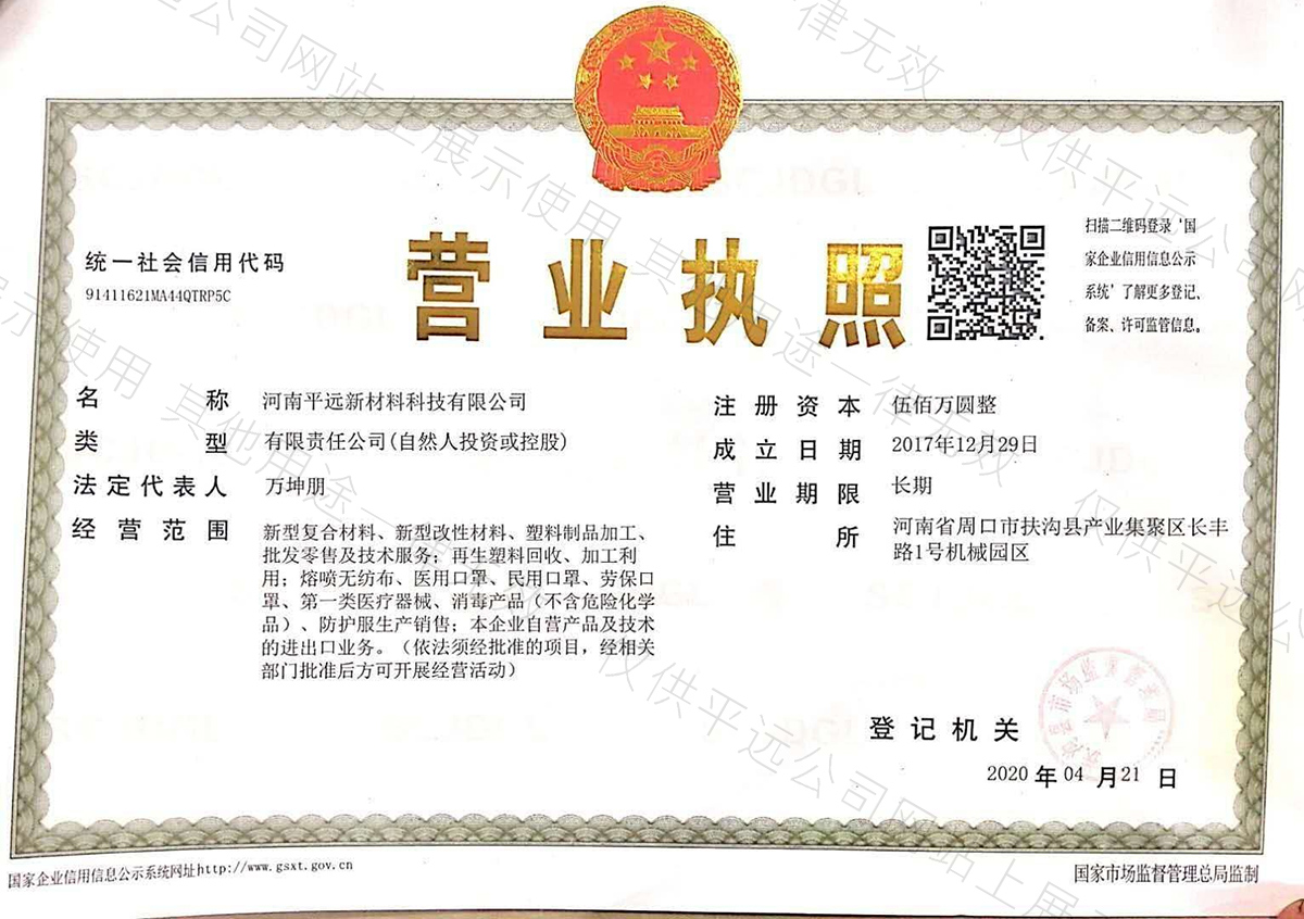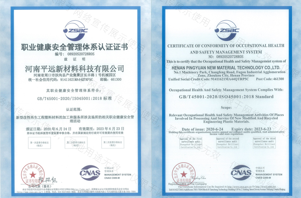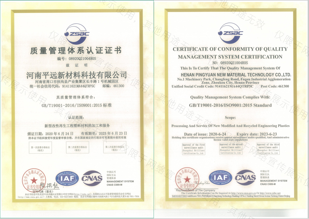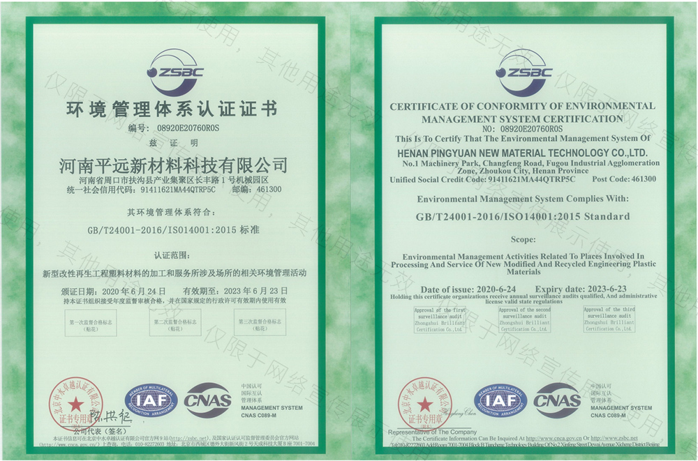 河南平遠新材料科技有限公司生產基地坐落于河南省鄢陵縣先進制造業(yè)開發(fā)區(qū),工廠占地10000平方米。公司通過GRS全球回收標準認證、ISO9001質量體系、14001環(huán)境體系和45001職業(yè)健康安全管理體認證。華東分公司位于浙江省余姚市中國塑料城。